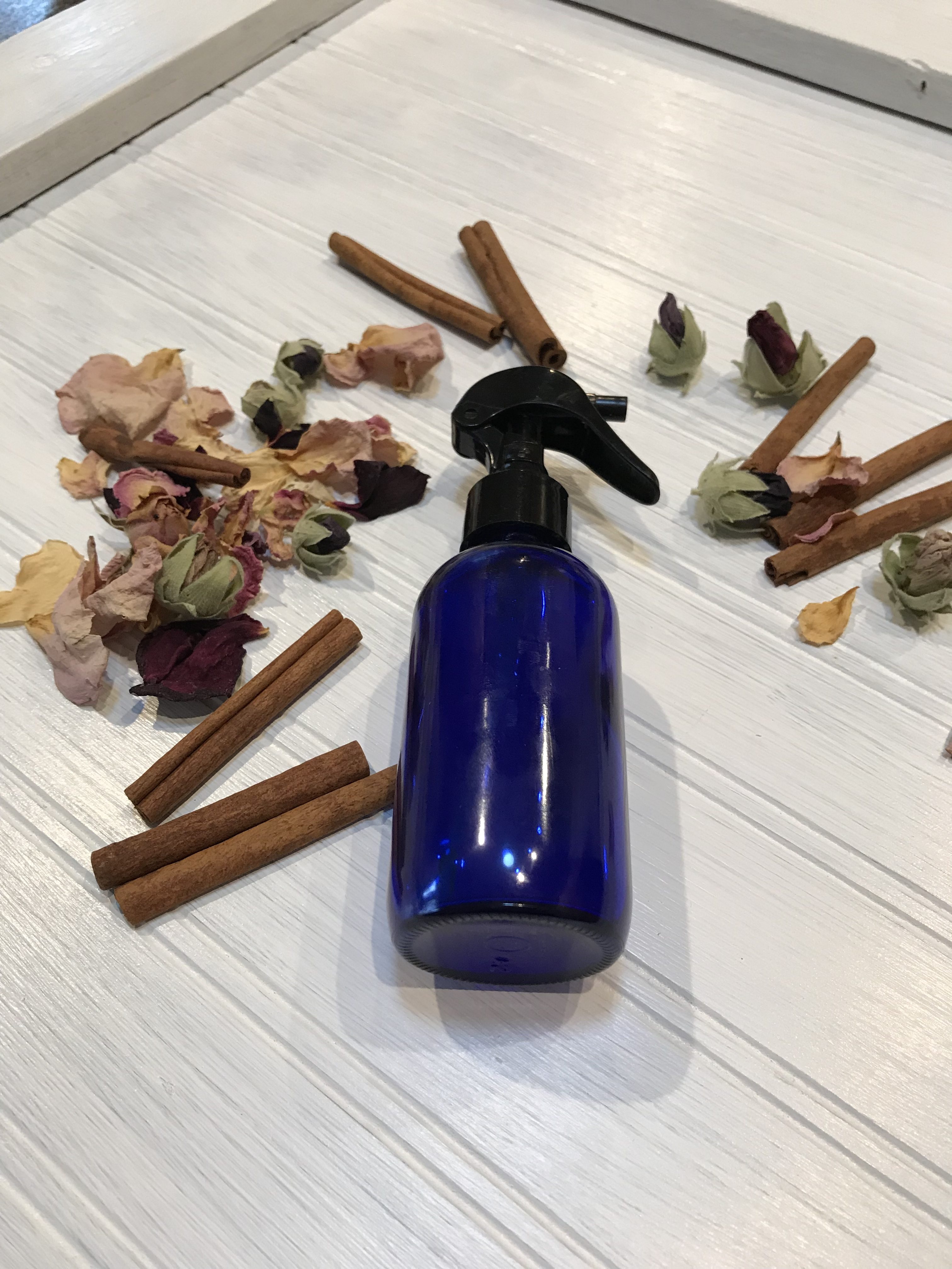 Then just shake the bottle lightly as you spray each time. That shaking will mix the oils in the water and diffuse them into the air.