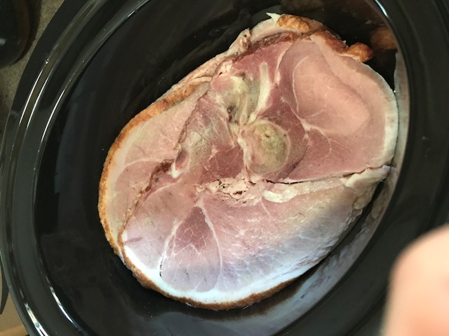 Put a ham steak in the bottom of a crock pot.