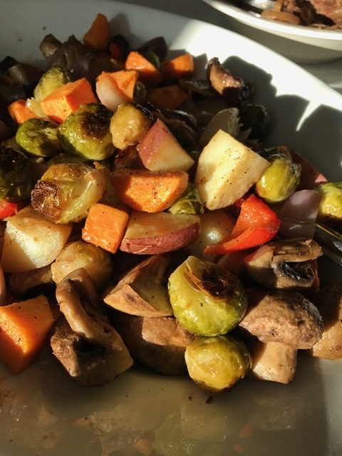 Simply cut up potatoes, peppers, mushrooms, Brussels sprouts, beets,onions and sweet potatoes, or whatever vegetables you have. Try to make them uniform, all about the same size, 1″ pieces works well. Then put them on a roasting pan or cookie sheet, drizzle with olive oil and sprinkle them with salt, pepper, granulated garlic, rosemary, and or whatever spices you love. Stir a bit to coat evenly. Then roast for 30-45 minutes at 375°- 400° (the hotter, the browner.) Stir once or twice while cooking. .